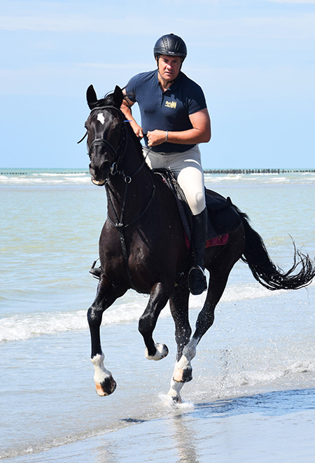 Débourré chez nous en novembre 2010, Thor, assez chic et mis en valeur par sa belle robe noire présente bien.  Porteur, il se rend indispensable avec les quelques élèves adultes de bonne taille. Muni d’un tempérament plutôt calme, mais parfois émotionnellement instable, il se crispe aisément. Un peu trop de main, il s’accule ! Une minuscule faute à l’abord d’un obstacle, il s’arrête !